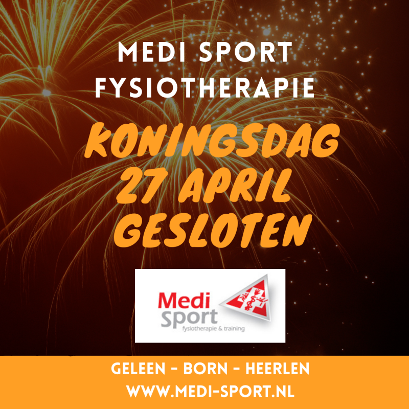 De praktijklocaties van Medi Sport Fysiotherapie in Geleen, Born en Heerlen zijn Koningsdag 27 april de hele dag gesloten. Vrijdag 28 april staan onze fysiotherapeuten weer voor u klaar.